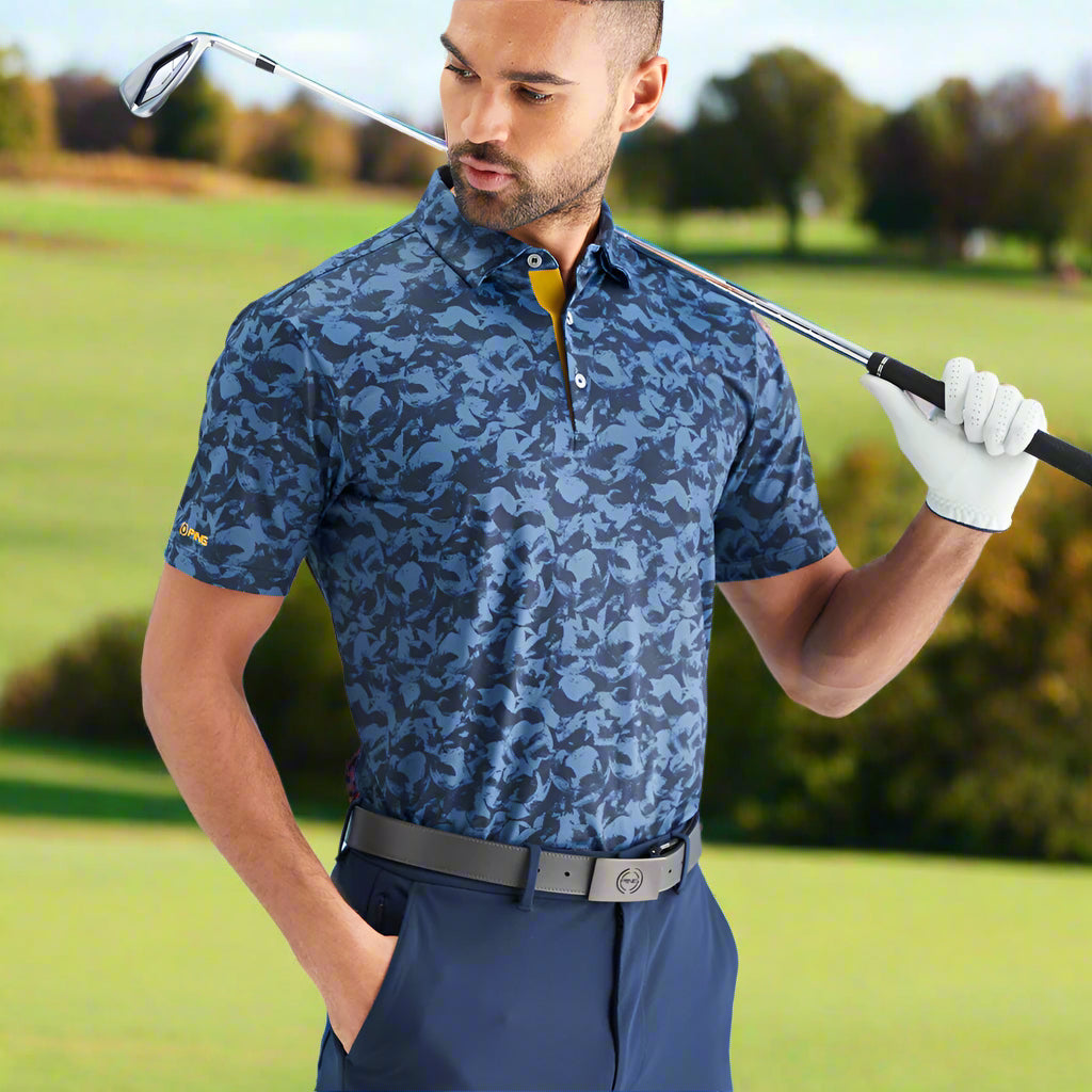 The self-material collar, three button placket and patterned material gives the polo a relaxed and fun look for a shirt that can be worn on and off the course.